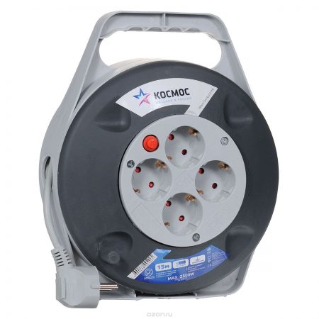 Удлинитель КОСМОС рулетка, 10м, ПВС 3х1, 4 гнезда, заземление, защита от детей и перегрева 16А YRKsm